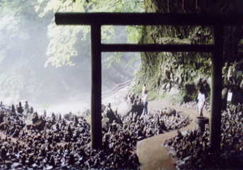 天安河原(あまのやすかわら) 天岩戸のにこもった「天照大神」(あまてらすおおみかみ)を外へ迎え出すために、 八百万(やおよろず)の神々が相談したところ、と伝わる。